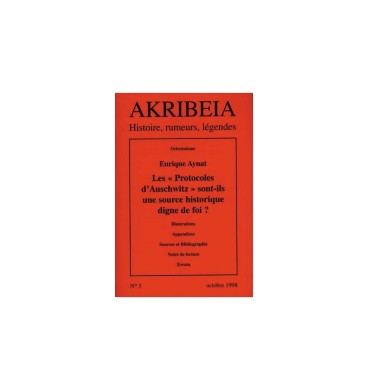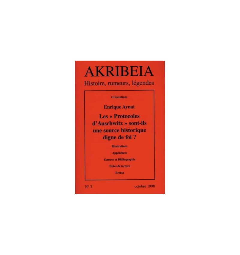 Enrique Aynat : Les « Protocoles d’Auschwitz » sont-ils une source historique digne de foi ? (Les documents. – Établissement et détermination des meilleurs textes. – Critique externe, critique de provenance. – Critique interne, confrontation des textes. – La question de la véracité des Protocoles. – La rencontre présumée au monastère de Svaty Jur. – Les déclarations de Rudolf Vrba et d’Alfred Wetzler. – Vérification des témoignages. – Conclusions.) — Illustrations. — Appendices. — Notes de lecture (ouvrages de Carlo Mattogno, Valentina Pisanty, Carlos Porter & Vincent Reynouard, Gerd Honsik, Pierre Guillaume, Jean-Marie Boisdefeu, Robert Faurisson, Régis Baty, Guy Bousquet, James Bacque, E. Thomas Wood, Alexander Baron, Dominique Vidal, Philip E. Johnson, Richard Webster, Olivier Dard).