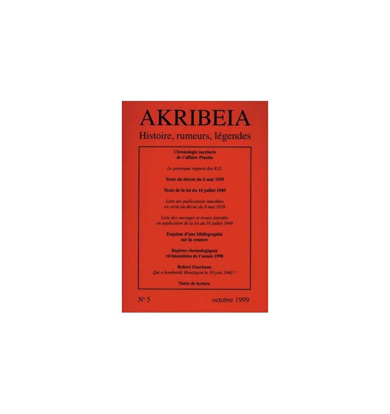 Chronologie de l’affaire Plantin (petite contribution à une histoire de la censure en France à la fin du xxe siècle). — Le grotesque rapport des Renseignements généraux de Lyon. — Le décret du 6 mai 1939. — La loi du 16 juillet 1949. — Liste quasi exhaustive des publications interdites en France (plus de 6 000 titres date par date). — Esquisse d’une bibliographie sur la censure. — Repères chronologiques révisionnistes de 1998. — Robert Faurisson : Qui a bombardé Montluçon le 19 juin 1940 ? — Notes de lecture (ouvrages de Carlo Mattogno, Arthur R. Butz, Jean-Jacques Pauvert, Peter Phillips, Robert Faurisson, Hubert de Beaufort, Albert Londres, Paul-Éric Blanrue, Henri de Fersan, Gerhart M. Riegner, etc. ; nombreuses revues).