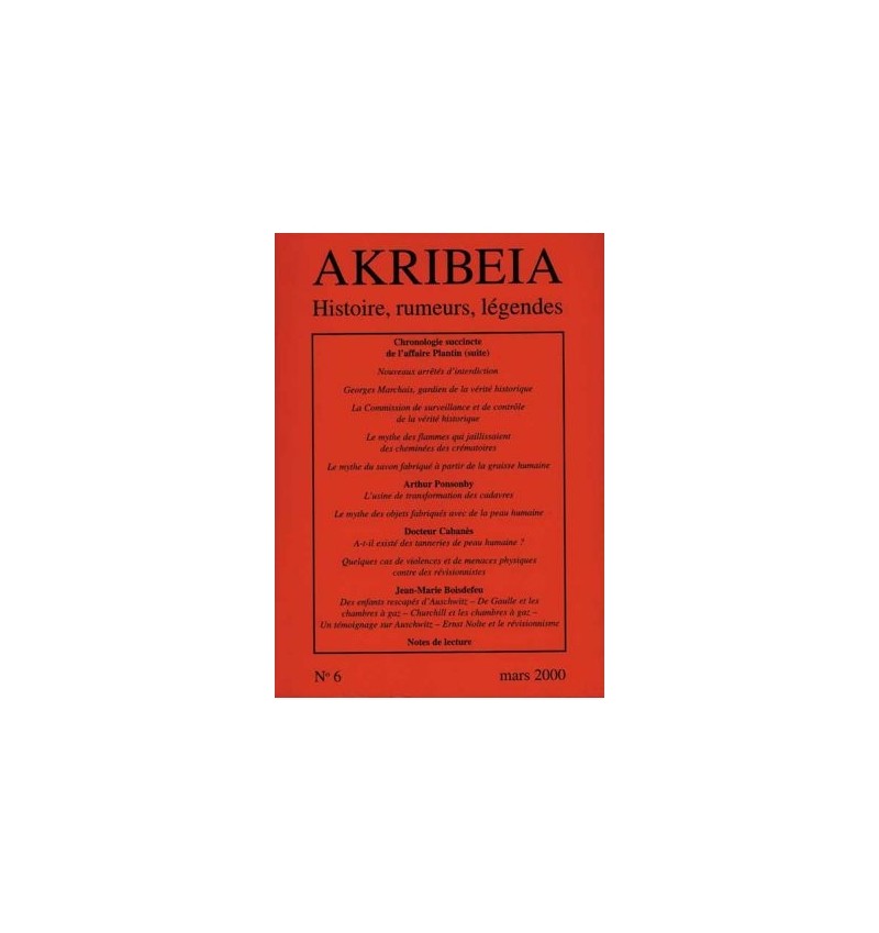 Suite de la chronologie de l’extravagante affaire Plantin. — Enquête sur quelques mythes de l’univers concentrationnaire : le savon humain, les peaux tatouées tannées, les flammes jaillissant des crématoires. Aussi : les tanneries de peau humaine pendant la Révolution française et l’usine allemande de transformation des cadavres pendant la première guerre mondiale, les violences contre les révisionnistes, articles de Jean-Marie Boisdefeu sur Auschwitz. — Nombreuses notes de lecture (Jürgen Graf, Richard Harwood, Maurice Bardèche, Heinrich Wendig, Herbert Verbeke, David Duke, Klaus Sojka, Rudolf Czernin, Norberto R. Ceresole, Hartmut Stern, Jean-Marie Benjamin, Aimé Bonifas, Thierry Crépin, Yves Ternon, Elena Lappin, Michael Pollak, Laird Wilcox, Pierre Chandelier, Daniel Easterman).