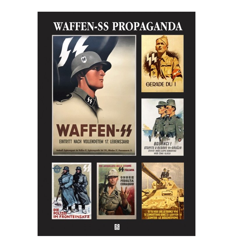 La plus grande collection d'affiche de la Waffen-SS Réunie, plus de150 affiches pleines pages, en tout plus de trois cents illustrations y compris une présentation des principaux graphistes de l'époque avec un échantillonage de leurs œuvres. 208 Pages en couleur, grand format, album relié sur papier glacé, édition originale bilingue français-anglais limitée à 1000 exemplaires.